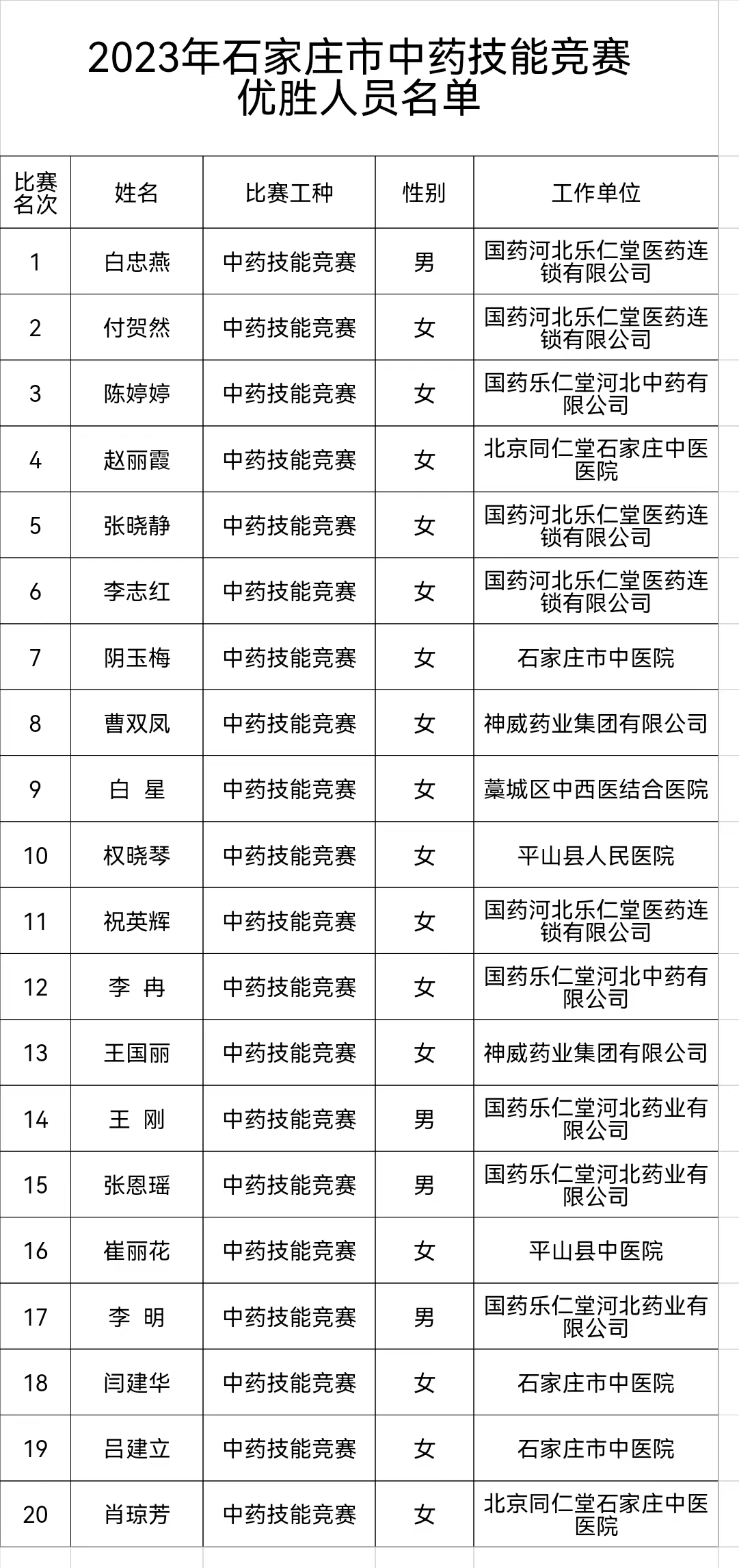 2023年石家庄市中药技能竞赛优胜人员名单